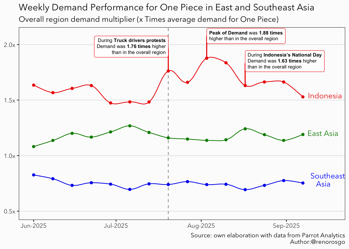 ### Labels and data points for visuals #### Create a tibble with the coordinates of market labelslabels = data %>%# Group by marketgroup_by(market) %>%# Keep the last observationfilter(date ==max(date)) %>%# This trick is just to have a nice labelmutate(market =ifelse(# For the 'Southeast Asia' labeltest = market =='Southeast Asia',# Add a nice line break and centered textyes ='Southeast east\n Asia', # The rest stay the sameno = market ) )# Get min date limitmin_date = data %>%filter(date ==min(date)) %>%pull(date) %>%unique() # Get max date limitmax_date = data %>%filter(date ==max(date)) %>%pull(date) %>%unique() ## Save relevant dates and demand ### Cutoff date ('2025-07-20')cutoff =ymd('2025-07-20')# Truck protest datetruck_date = data %>%filter(market =='Indonesia', date ==ymd('2025-07-20')) %>%pull(date)# Truck protest demandtruck_demand = data %>%filter(market =='Indonesia', date ==ymd('2025-07-20')) %>%pull(region_multiplier)# Indonesia's National day datenational_day_date = data %>%filter(market =='Indonesia', date ==ymd('2025-08-17')) %>%pull(date)# Indonesia's National day demandnational_day_demand = data %>%filter(market =='Indonesia', date ==ymd('2025-08-17')) %>%pull(region_multiplier)# Peak demand's datepeak_date = data %>%filter(market =='Indonesia') %>%filter(region_multiplier ==max(region_multiplier)) %>%pull(date)# Peak demandpeak_demand = data%>%filter(market =='Indonesia') %>%filter(region_multiplier ==max(region_multiplier)) %>%pull(region_multiplier)### Overal Time Series #### Create a ggplot canvasggplot(# Data to plotdata = data, # Data-related aestheticsmapping =aes(x = date, y = region_multiplier, col = market) ) +# ggalt geom_xpline give us soft lines using splinesgeom_xspline(spline_shape =-0.5) +# Add vertical linegeom_vline(# This is the week when the first flag was shown (at leas in the news)xintercept =c(cutoff),# Modify the aestheticslinetype ='dashed', col ='gray60' ) +# Add pointsgeom_point() +# Add textgeom_text(# Use our labeled datadata = labels, aes(label = market), # Modify justification and lineheightvjust =0.25, hjust =-0.15, lineheight =0.9 ) +# Add segemnt from point to labelgeom_segment(# X coordsx = truck_date, xend = truck_date, # Y coordsy = truck_demand, yend = truck_demand +0.2,# Set aestheticscol ='red2' ) +# Annotate the relevant textannotate(# Use GeomRichtext as geomgeom = ggtext::GeomRichtext,# Set coordinatesx = truck_date, y = truck_demand +0.22,# Set labellabel =sprintf(# Html and linked to data formatfmt ="<span style='color:black'>During **Truck drivers protests**<br>Demand was **%s times** higher<br>than in the overall region</span>",round(x = truck_demand, digits =2) ),# Set aestheticssize =2.5, hjust =1, vjust =0.5, color ='red2', ) +# Add segemnt from point to labelgeom_segment(# X coordsx = national_day_date, xend = national_day_date, # Y coordsy = national_day_demand, yend = national_day_demand +0.2,# Set aestheticscol ='red2' ) +# Annotate the relevant textannotate(# Use GeomRichtext as geomgeom = ggtext::GeomRichtext,# Set coordinatesx = national_day_date, y = national_day_demand +0.22,# Set labellabel =sprintf(# Html and linked to data formatfmt ="<span style='color:black'>During **Indonesia's National Day**<br>Demand was **%s times** higher<br>than in the overall region</span>",round(x = national_day_demand,digits =2) ),# Set aestheticssize =2.5, hjust =0, vjust =0.5, color ='red2', ) +# Add segemnt from point to labelgeom_segment(# X coordsx = peak_date, xend = peak_date, # Y coordsy = peak_demand, yend = peak_demand +0.2,# Set colorcol ='red2' ) +# Annotate the relevant textannotate(# Use GeomRichtext as geomgeom = ggtext::GeomRichtext,# Set coordinatesx = peak_date, y = peak_demand +0.2,# Html and linked to data formatlabel =sprintf(fmt ="<span style='color:black'>**Peak of Demand** was **%s times**<br>higher than in the overall region</span>",round(x = peak_demand, digits =2) ),# Set aestheticssize =2.5, hjust =0, vjust =0.5, color ='red2', ) +# Add labelslabs(title ='Weekly Demand Performance for One Piece in East and Southeast Asia',subtitle ='Overall region demand multiplier (x Times average demand for One Piece)',caption ='Source: own elaboration with data from Parrot Analytics\nAuthor:@renorosgo' ) +# Modify color scale (I repeated blue to match our modified label of Southeast East Asia)scale_color_manual(values =c('green4','red2','blue2','blue')) +# Modify x axis limitsscale_x_date(limits =c(min_date, max_date +10), date_labels ="%b-%Y") +# Modify y axis limits and label unitsscale_y_continuous(limits =c(0.5,NA), labels = scales::unit_format(suffix ='x')) +# Set the base themetheme_bw(paper ='gray99', base_family ='Avenir Next') +# Additional tweaks to the theme theme(# Remove titles from de axisaxis.title =element_blank(),# Delete some gridspanel.grid.minor =element_blank(),panel.grid.major.x =element_blank(),# Remove legend (recommended to avoid writing to many `show.legend = F`)legend.position ='none' )