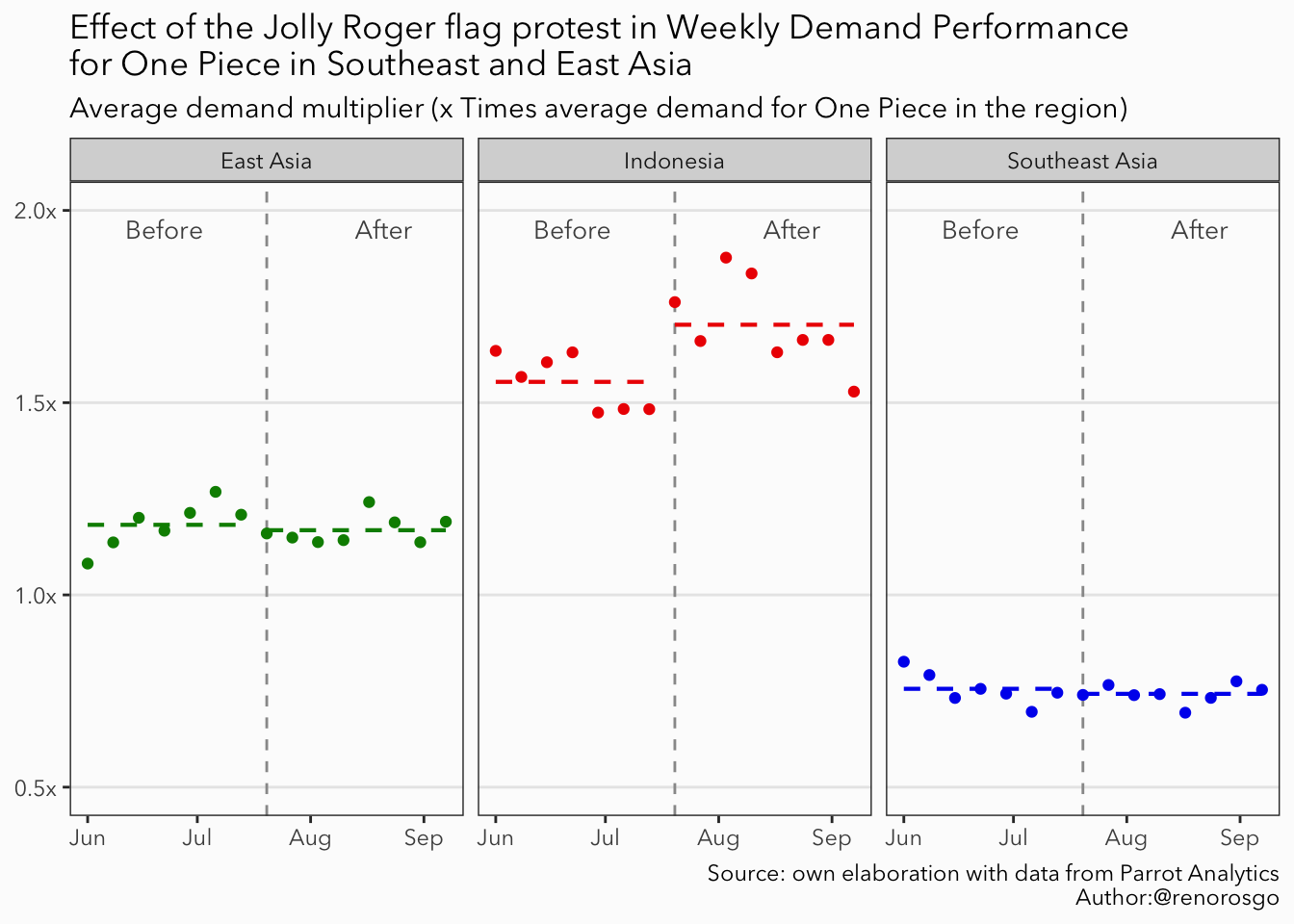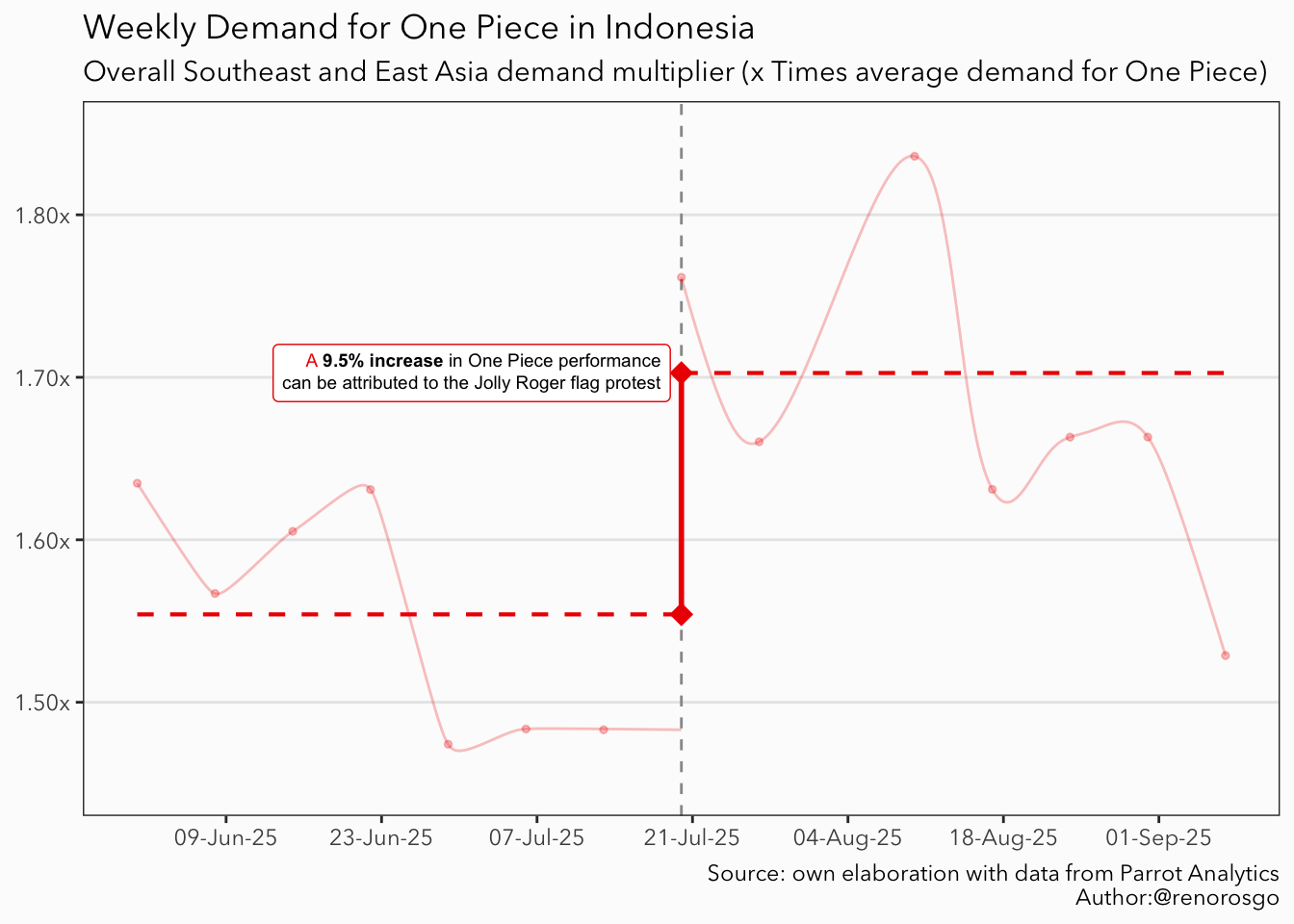 Popular culture has evolved beyond mere entertainment; it has become a significant medium for self-expression and social connection. In Indonesia, a surprising symbol of rebellion, adventure, and resistance against oppression has emerged among protesters. But how strong is the symbolic significance of this emblem? In this post, we will explore how data from the entertainment industry can illuminate the role of One Piece in Indonesia’s protests. By employing causal inference methods and data from Parrot Analytics, we aim to determine whether the popularity of this fictional world reflects real-life actions and what this reveals about the relationship between pop culture and social change.