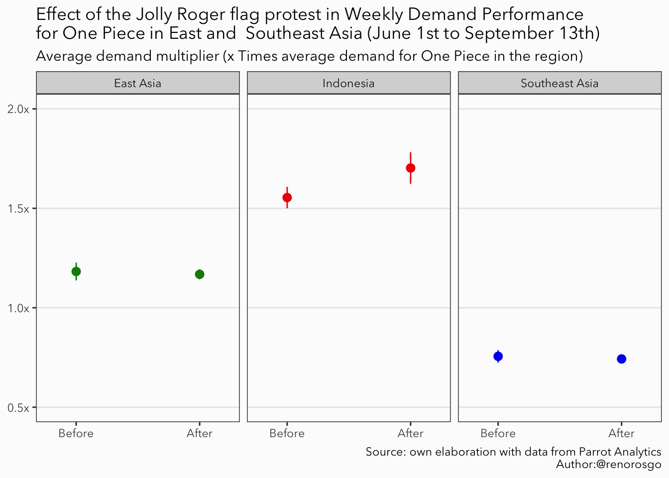 ### Average before and after effects #### Create a ggplot canvasggplot(data = data, mapping =aes(x = intervention, y = region_multiplier, color = market) ) +# Add points with 1.96 sestat_summary(geom ='pointrange', fun.data ='mean_se', fun.args =list(mult =1.96)) +# Add labelslabs(title ='Effect of the Jolly Roger flag protest in Weekly Demand Performance\nfor One Piece in East and Southeast Asia (June 1st to September 13th)',subtitle ='Average demand multiplier (x Times average demand for One Piece in the region)',caption ='Source: own elaboration with data from Parrot Analytics\nAuthor:@renorosgo' ) +scale_x_continuous(breaks =c(0,1), labels =c('Before', 'After'), limits =c(-0.25,1.25)) +facet_wrap(~market) +scale_color_manual(values =c('green4','red2','blue2')) +# Modify Y axis limits and unitsscale_y_continuous(limits =c(0.5,2), labels = scales::unit_format(suffix ='x')) +# Set the base themetheme_bw(paper ='gray99', base_family ='Avenir Next') +# Additional tweaks to the theme theme(# Remove titles from de axisaxis.title =element_blank(),# Delete some gridspanel.grid.minor =element_blank(),panel.grid.major.x =element_blank(),# Remove legend (recommended to avoid writting to many `show.legend = F`)legend.position ='none' )