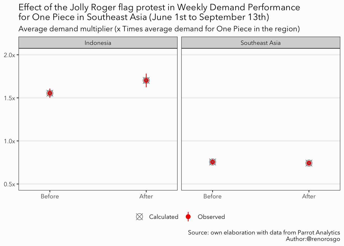 ### diff in diff graph ###did_df =tibble(# Market namemarket =c('Indonesia', 'Indonesia','Southeast Asia','Southeast Asia'),# Intervention columnintervention =c(0 , 1, 0, 1),# Treatment columntreatment =c(1, 1, 0, 0),# Calculated valuresvalues =c(before_treatment, after_treatment, before_control, after_control))# Create a ggplot canvasggplot(data = data_se, mapping =aes(x = intervention, y = region_multiplier)) +# Add points with 1.96 sestat_summary(# Add colourmapping =aes(color ='Observed'), # Additional aestheticsgeom ='pointrange', fun.data ='mean_se', fun.args =list(mult =1.96) ) +# Add our calculated averagesgeom_point(data = did_df, mapping =aes(x = intervention, y = values, col ='Calculated'), # Modify aestheticsshape =13, size =4 ) +# Add labelslabs(title =bquote('Effect of the Jolly Roger flag protest in Weekly Demand Performance\nfor One Piece in Southeast Asia (June 1st to September 13th)'),subtitle ='Average demand multiplier (x Times average demand for One Piece in the region)',caption ='Source: own elaboration with data from Parrot Analytics\nAuthor:@renorosgo',color ="Mean"# Legend title ) +# Split by marketfacet_wrap(~market) +# Modify scalesscale_x_continuous(breaks =c(0,1), labels =c('Before', 'After'), limits =c(-0.25,1.25)) +# Modify Y axis limits and unitsscale_y_continuous(limits =c(0.5,2), labels = scales::unit_format(suffix ='x')) +# Scale colorscale_color_manual(values =c('gray50','red2')) +# Set the base themetheme_bw(paper ='gray99', base_family ='Avenir Next') +# Additional tweaks to the theme theme(# Remove titles from de axisaxis.title =element_blank(),# Delete some gridspanel.grid.minor =element_blank(),panel.grid.major.x =element_blank(),legend.position ='bottom',legend.title =element_blank() )
