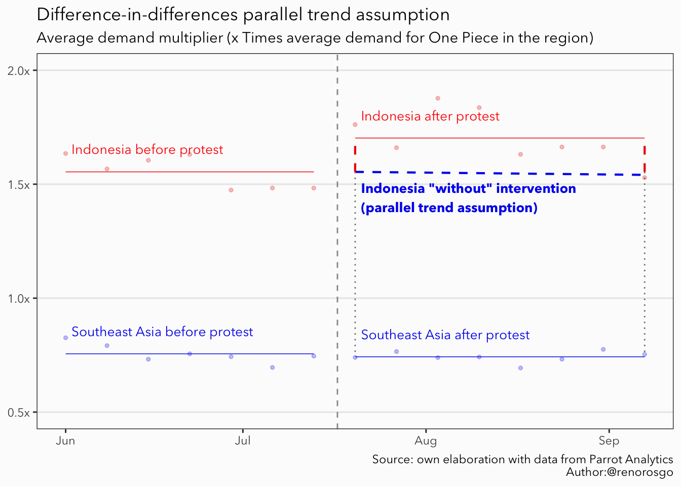 # Min x for segment annotationmin_x = data_se %>%filter(date >= cutoff) %>%pull(date) %>%min()# Max x for segment annotationmax_x = data_se %>%filter(date >= cutoff) %>%pull(date) %>%max()# Create a ggplot canvasggplot(# Data to plotdata = data_se, # Data-related aestheticsmapping =aes(x = date, y = region_multiplier, col = market) ) +# Add vertical linegeom_vline(# This is the week when the first flag was shown (at least in the news)xintercept =c(cutoff) -3,# Modify the aestheticslinetype ='dashed', col ='gray60' ) +# Add pointgeom_point(size =1, alpha =0.25) +# Add a dashed line with the average multiplier for the Beforestat_smooth(data =filter(data_se, date < cutoff),mapping =aes(x = date, y = average_multiplier, col = market),method ='lm', linewidth =0.25 ) +# Add a dashed line with the average multiplier for the Afterstat_smooth(data =filter(data_se, date >= cutoff),mapping =aes(x = date, y = average_multiplier, col = market),method ='lm', linewidth =0.25 ) +# Draw the parallel trendannotate(geom ='segment',# Set coordinatesx = min_x, xend = max_x, y = before_treatment, yend = after_treatment - diff_in_diff,# Set aestheticslinetype ='dashed', col ='blue2', linewidth =0.75 ) +# Add vertical gray projection linesannotate(geom ='segment',# Set coordinatesx =c(min_x, max_x), xend =c(min_x, max_x), y = before_treatment, yend = before_control,# Set aestheticslinetype ='dotted', col ='gray50' ) +# Add the potential effectannotate(geom ='segment',# Set coordinatesx =c(min_x, max_x), xend =c(min_x, max_x), y = before_treatment, yend = after_treatment,# Set aestheticslinetype ='dashed', col ='red2', linewidth =0.75 ) +# Add textannotate(geom ='text', label ='Indonesia before protest', # Set coordinatesx =c(ymd('2025-06-02')), y = before_treatment +0.1,# Set aestheticssize =3.5, color ='red', hjust =0 ) +# Add textannotate(geom ='text', label ='Southeast Asia before protest', # Set coordinatesx =c(ymd('2025-06-02')), y = before_control +0.1,# Set aestheticssize =3.5, color ='blue2', hjust =0 ) +# Add textannotate(geom ='text', label ='Indonesia after protest', # Set coordinatesx = min_x +1, y = after_treatment +0.1,# Set aestheticssize =3.5, color ='red', hjust =0 ) +# Add textannotate(geom ='text', label ='Southeast Asia after protest', # Set coordinatesx = min_x +1, y = after_control +0.1,# Set aestheticssize =3.5, color ='blue2', hjust =0 ) +# Add textannotate(geom ='text', label ='Indonesia "without" intervention\n(parallel trend assumption)', # Set coordinatesx = min_x +1, y = after_treatment - diff_in_diff -0.1,# Set aestheticssize =3.5, color ='blue2', hjust =0, fontface ="bold" ) +# Add labelslabs(title ='Difference-in-differences parallel trend assumption',subtitle ='Average demand multiplier (x Times average demand for One Piece in the region)',caption ='Source: own elaboration with data from Parrot Analytics\nAuthor:@renorosgo' ) +# Modify colorsscale_color_manual(values =c('red2','blue2')) +# Modify Y axis limits and unitsscale_y_continuous(limits =c(0.5,2), labels = scales::unit_format(suffix ='x')) +# Set the base themetheme_bw(paper ='gray99', base_family ='Avenir Next') +# Additional tweaks to the theme theme(# Remove titles from de axisaxis.title =element_blank(),# Delete some gridspanel.grid.minor =element_blank(),panel.grid.major.x =element_blank(),# Remove legend (recommended to avoid writting to many `show.legend = F`)legend.position ='none' )